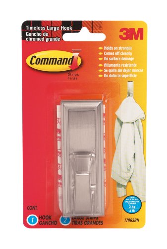 3M 17063BN Command Brushed Nickel Timeless Large Hook3M is a diversified technology company serving customers and communities with innovative products and services. 3M is committed to actively contributing to sustainable development through environmental protection, social responsibility and economic progress. Command; products hold on strongly, come off cleanly and leave no surface damage.3M 17063BN Command Brushed Nickel Timeless Large Hook Features:; Timeless style adhesive hook; Holds on strongly; Comes off cleanly; No nail holes; Brushed Nickel finish; Large design; Each hook holds 3 lbs; Includes 2 adhesive strips; Carded